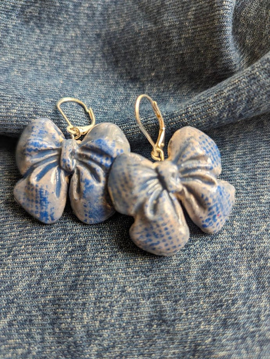 Blue Bow Ceramic Earrings REVERSIBLE Denim Textured